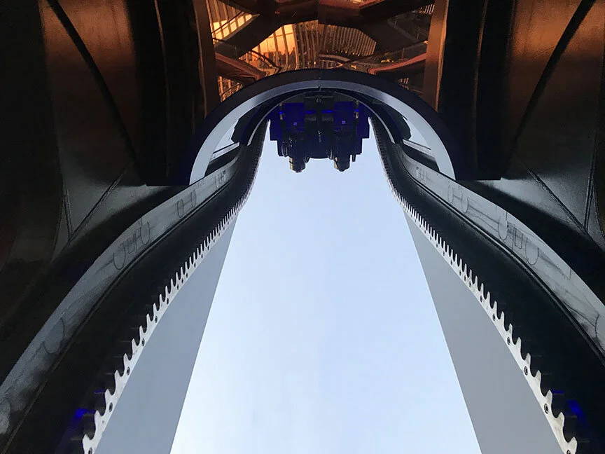 Located on the southern end, the unique glass elevating system by Heatherwick Studio forms a spine for the structure. Traveling along a curving track on the inside rim, the elevator makes two stops on the way to the eighth and top floor. The geared rack-and-pinion mechanism, as found on a funiculars similar the Millennium Bridge Inclinator in London or Odessa Funicular in Ukraine, keeps the elevator on track. What makes this the first of its type in the world, is a series of self levelling hydraulics to keep the cab level while an onboard electric traction motor slowly drives the elevator car up and down the series of sloping geared tracks. Aside from the shear scale of the project, this one of a kind kinetic component is the most interesting aspect of the Vessel and one that is too easily overlooked.