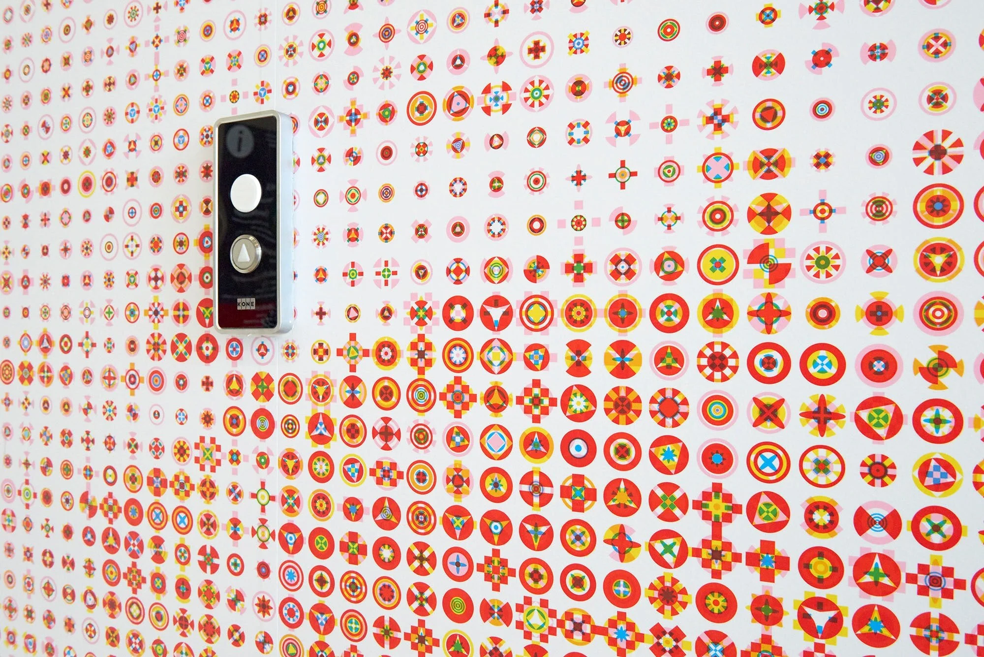 These photographs were then transformed into patterns made up of coloured pixels that are placed on top of one another to create an illusion of depth. Pentagram's team worked closely with the patients and staff of the hospital to develop a suitable visual solution for Martens’ proposal. We then art directed the piece, which spans the lift lobby’s approximately 350 sq m of wall space.